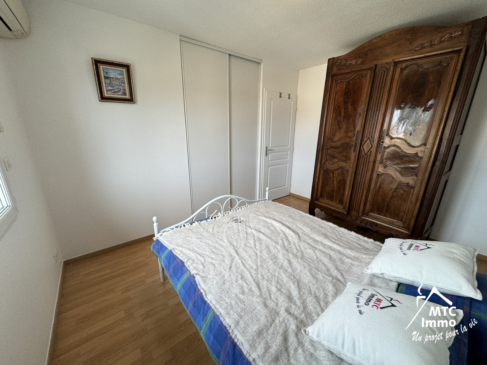 L'entrée de l'appartement (avec placard mural) donne un cellier/buanderie et sur une grande pièce de vie ouverte sur la cuisine. Depuis la pièce de vie, vous aurez accès à un balcon de 10 m². Celui-ci possède des stores électriques verticaux qui vous protègeront du soleil. Le dégagement de la partie nuit dessert deux chambres (avec chacune un placard mural), un WC et une salle de bains. Type de chauffage : radiateurs électriques, climatisation réversible dans la pièce de vie et dans les deux chambres. L'eau chaude sanitaire est produite par un cumulus électrique. Taxes foncières : 1 064 euros / an. Les charges de copropriété sont de 105 euros / mois (entretien des communs, des espaces verts, fonds travaux, ...). L'extérieur de la propriété est entièrement clôturé et arboré.