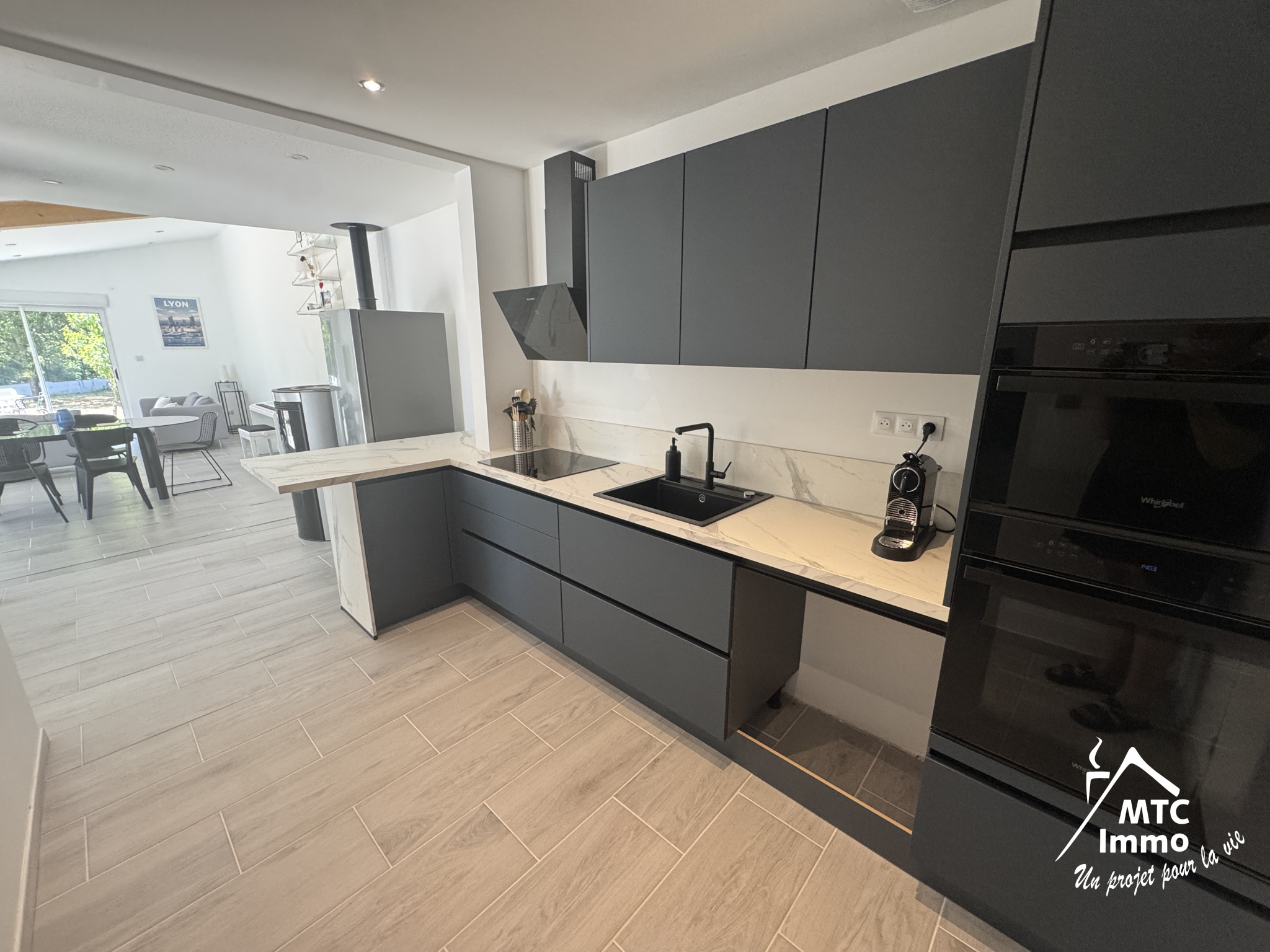 - Une pièce de vie lumineuse ouverte sur une cuisine neuve et moderne,