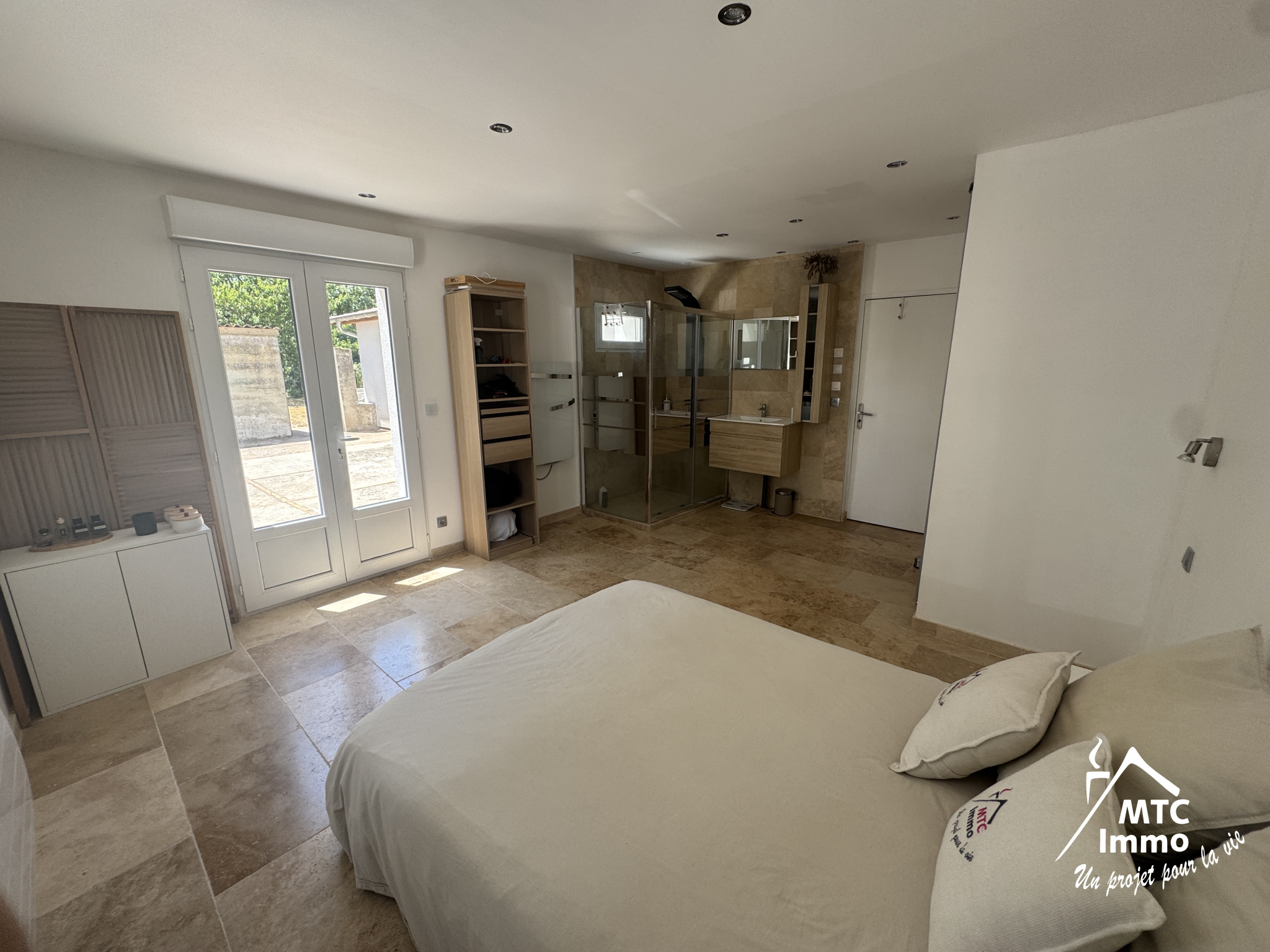 - Une suite parentale avec salle d’eau au sol en travertin,