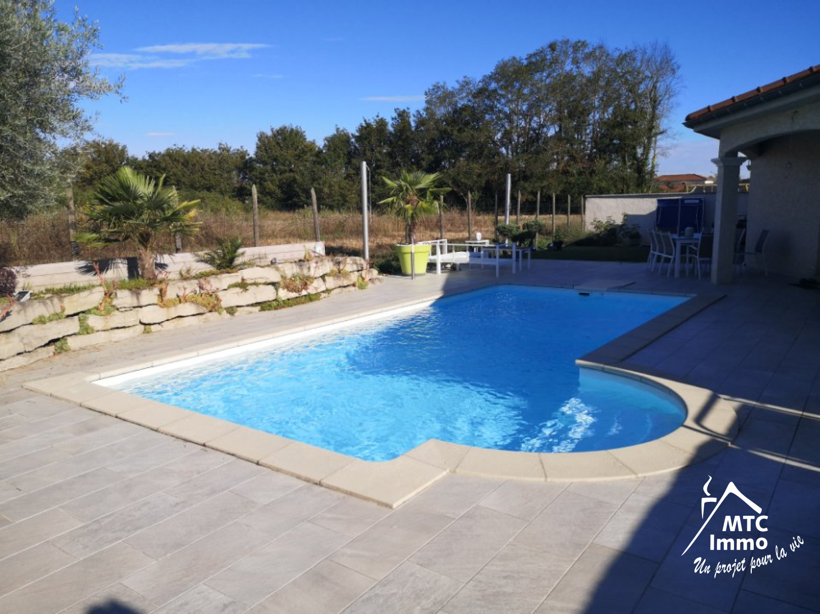 A l'extérieur les 100 m2 de plage et terrasse donnent un effet éclatant à la piscine. L'enrochement et la rocaille sont garnis par des arbres et des plantes méditerranéennes (type Olivier, palmier...).