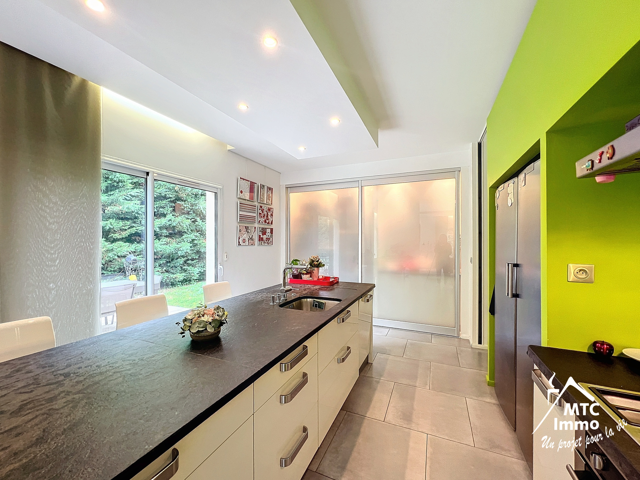 L'entrée s'ouvre sur une magnifique pièce de vie de 72m² avec une belle hauteur sous-plafond. De larges ouvertures laissent pénétrer la lumière naturelle de toutes parts. Vous pourrez ainsi jouir de l'espace salle à manger/salon en profitant de la vue sur le terrain arboré. La cuisine aux lignes épurées et modernes est dotée de nombreux rangements et d'un beau plan de travail. Elle sera le lieu idéal pour cuisiner et recevoir.