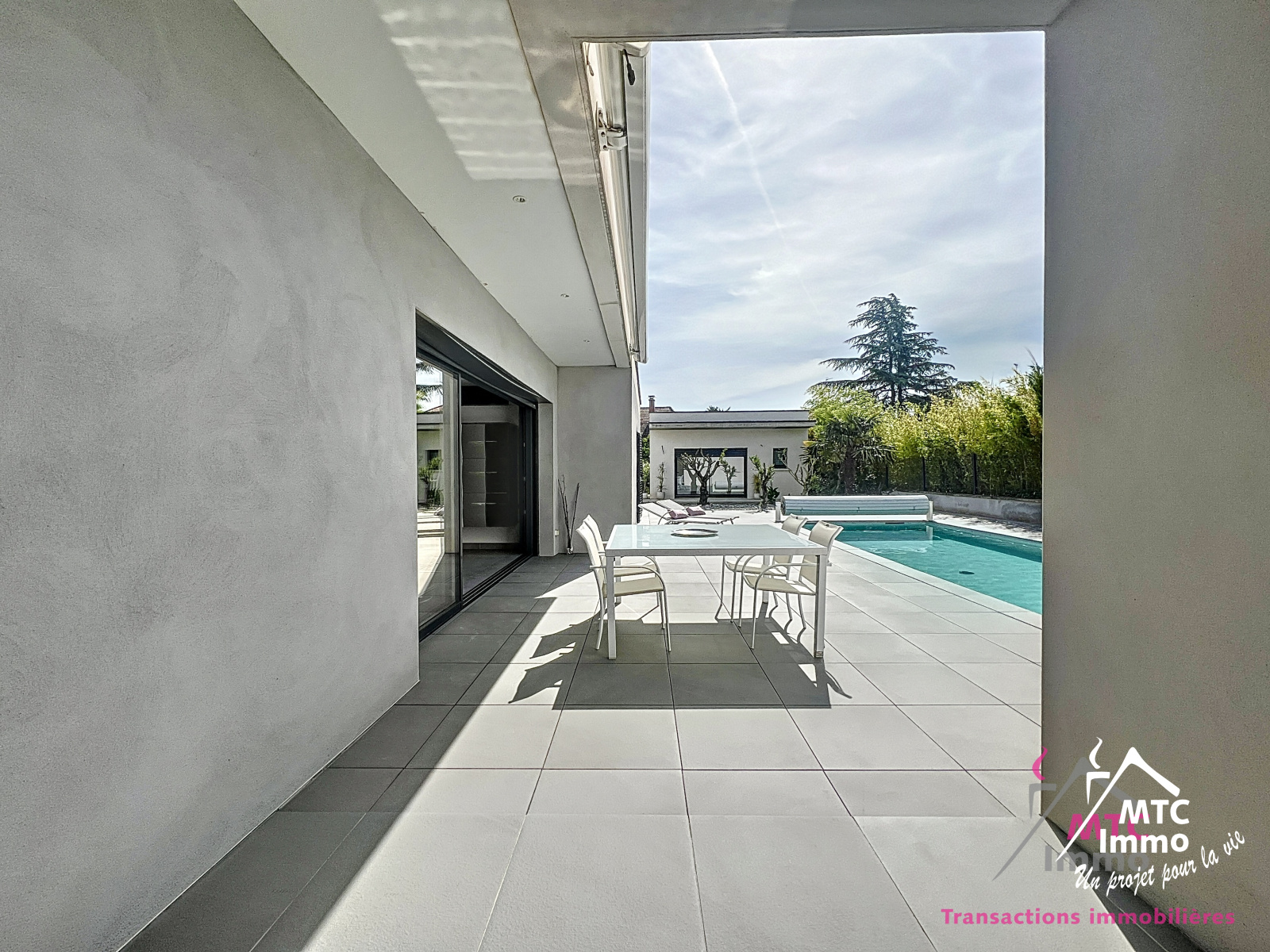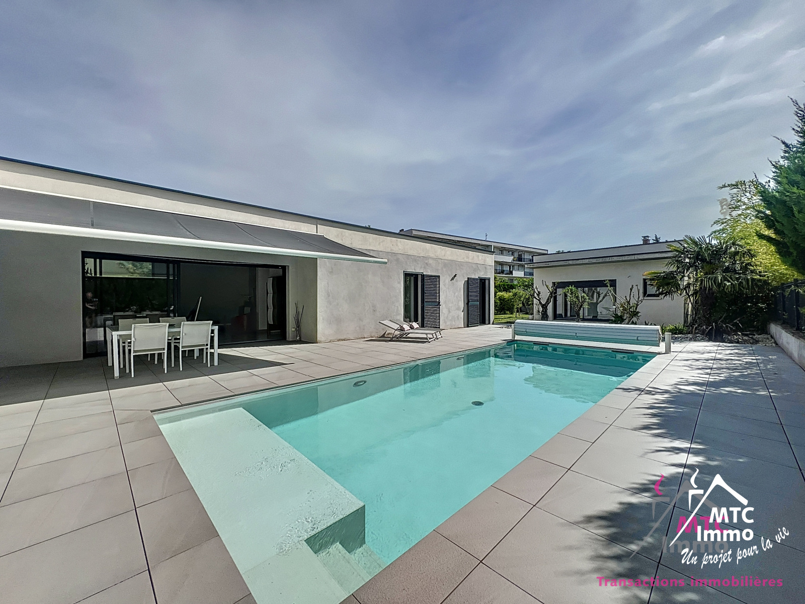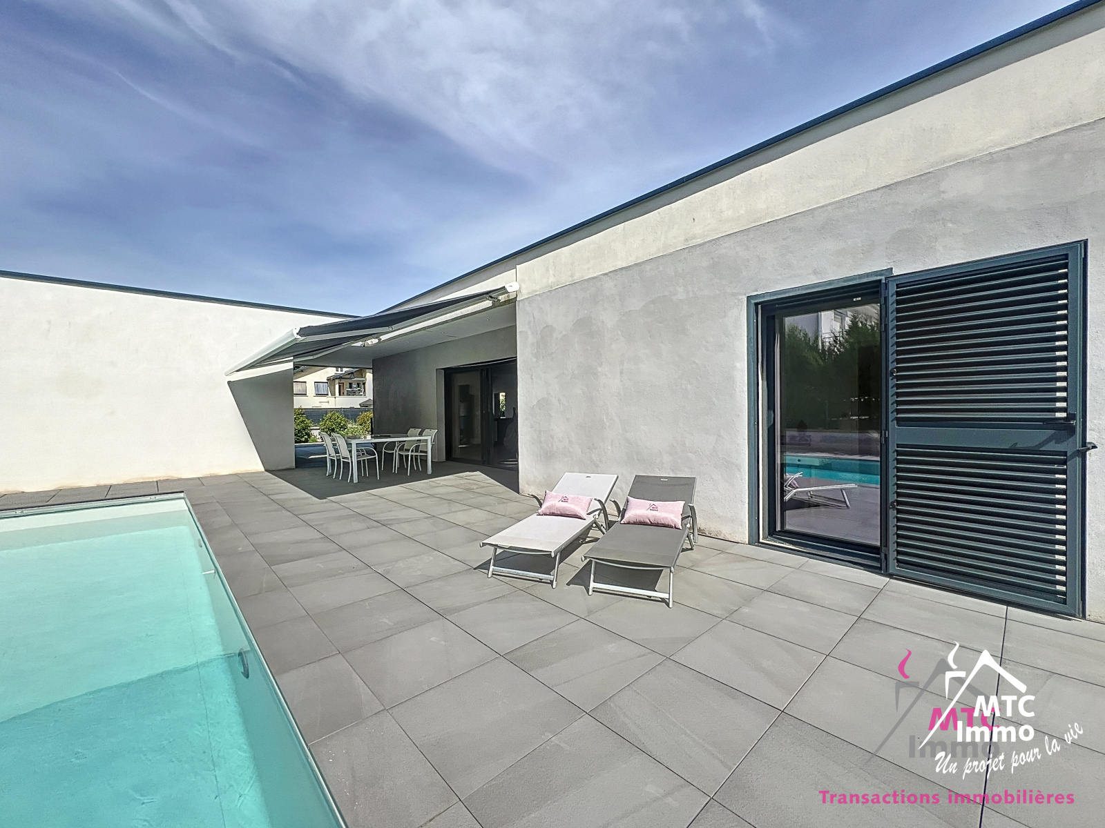 Une belle piscine au sel chauffée et automatisée vient parfaire les prestations haut-de-gamme de cette magnifique maison. La disposition des lumières extérieures permettent de sublimer les lignes architecturales de la maison à la nuit tombée. Le tout se trouvant sur un terrain plat de 900 m², au coeur des commodités (école, transports, commerces...)