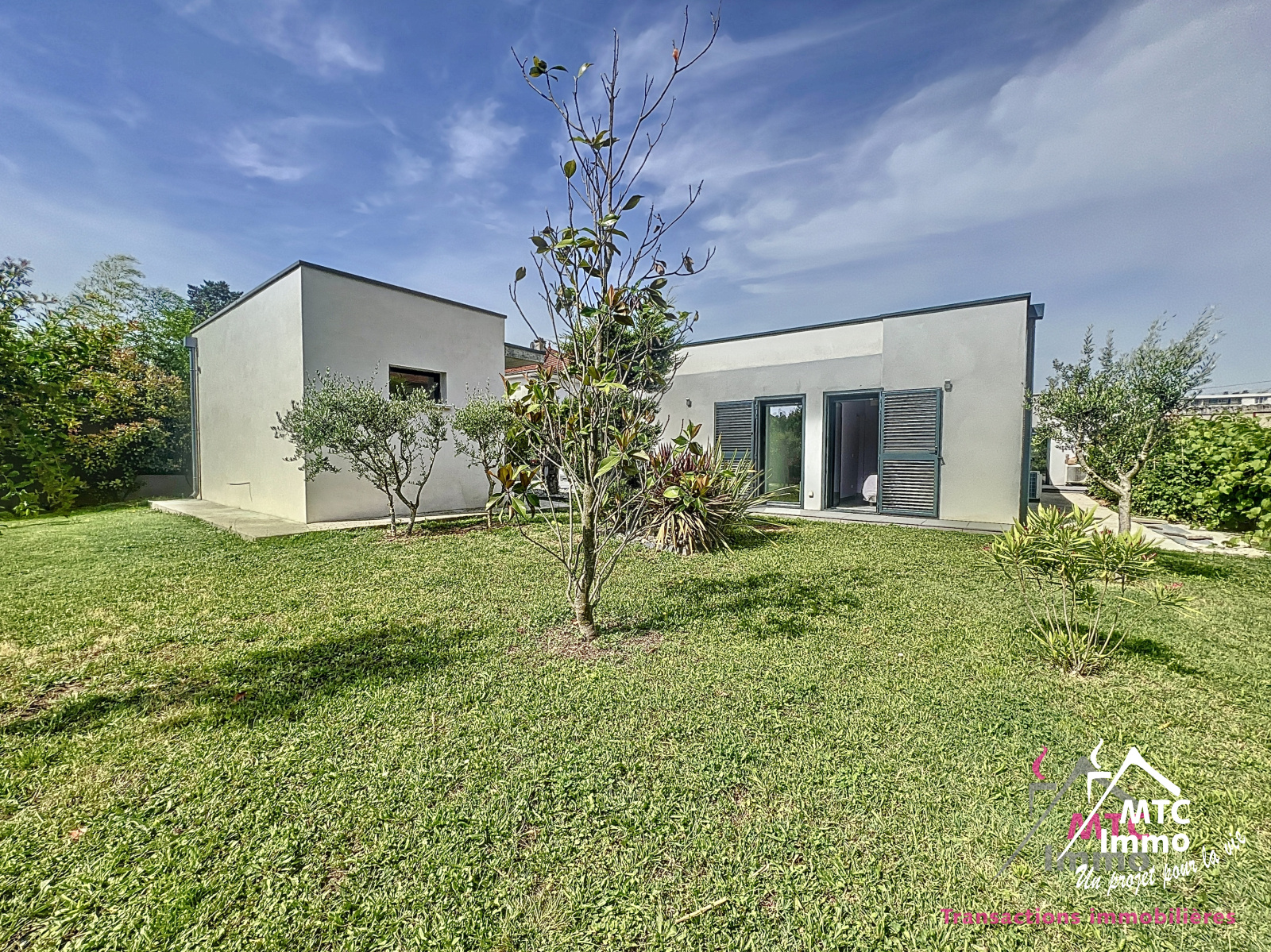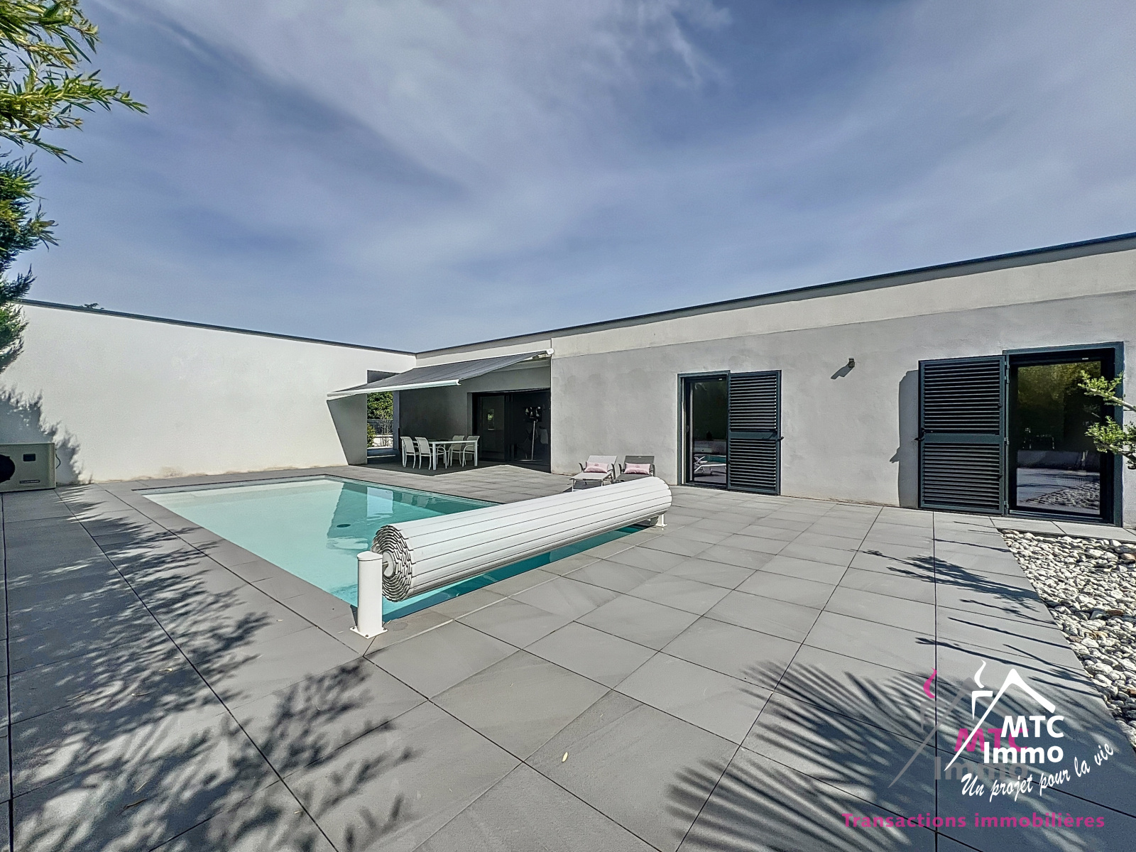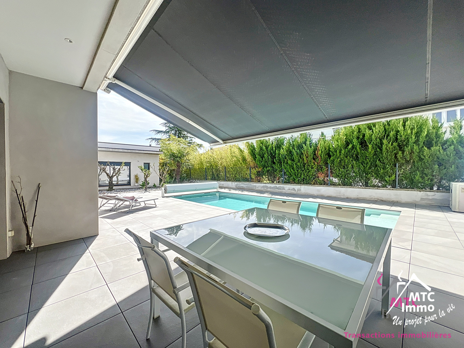 Une belle piscine au sel chauffée et automatisée vient parfaire les prestations haut-de-gamme de cette magnifique maison. La disposition des lumières extérieures permettent de sublimer les lignes architecturales de la maison à la nuit tombée. Le tout se trouvant sur un terrain plat de 900 m², au coeur des commodités (école, transports, commerces...)