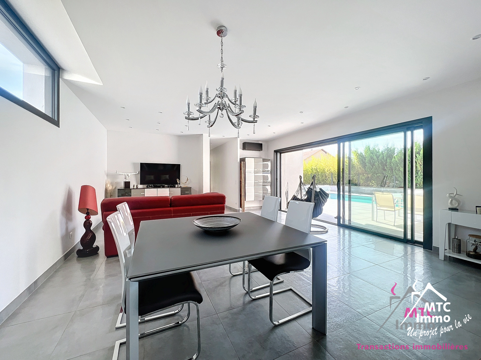 L'entrée s'ouvre sur une belle pièce de vie de 62m². De larges ouvertures laissent pénétrer la lumière naturelle de toutes parts. Vous pourrez ainsi jouir de l'espace salle à manger/salon en profitant de la vue sur la piscine été comme hiver.