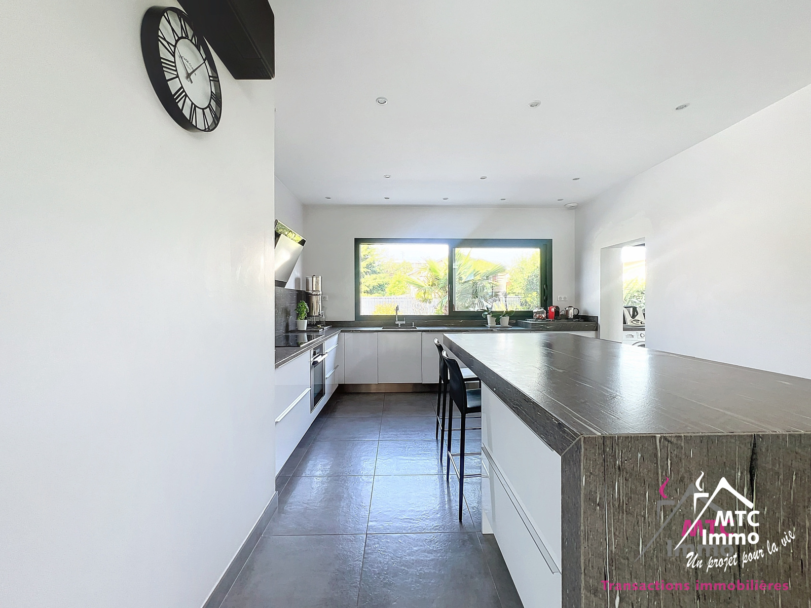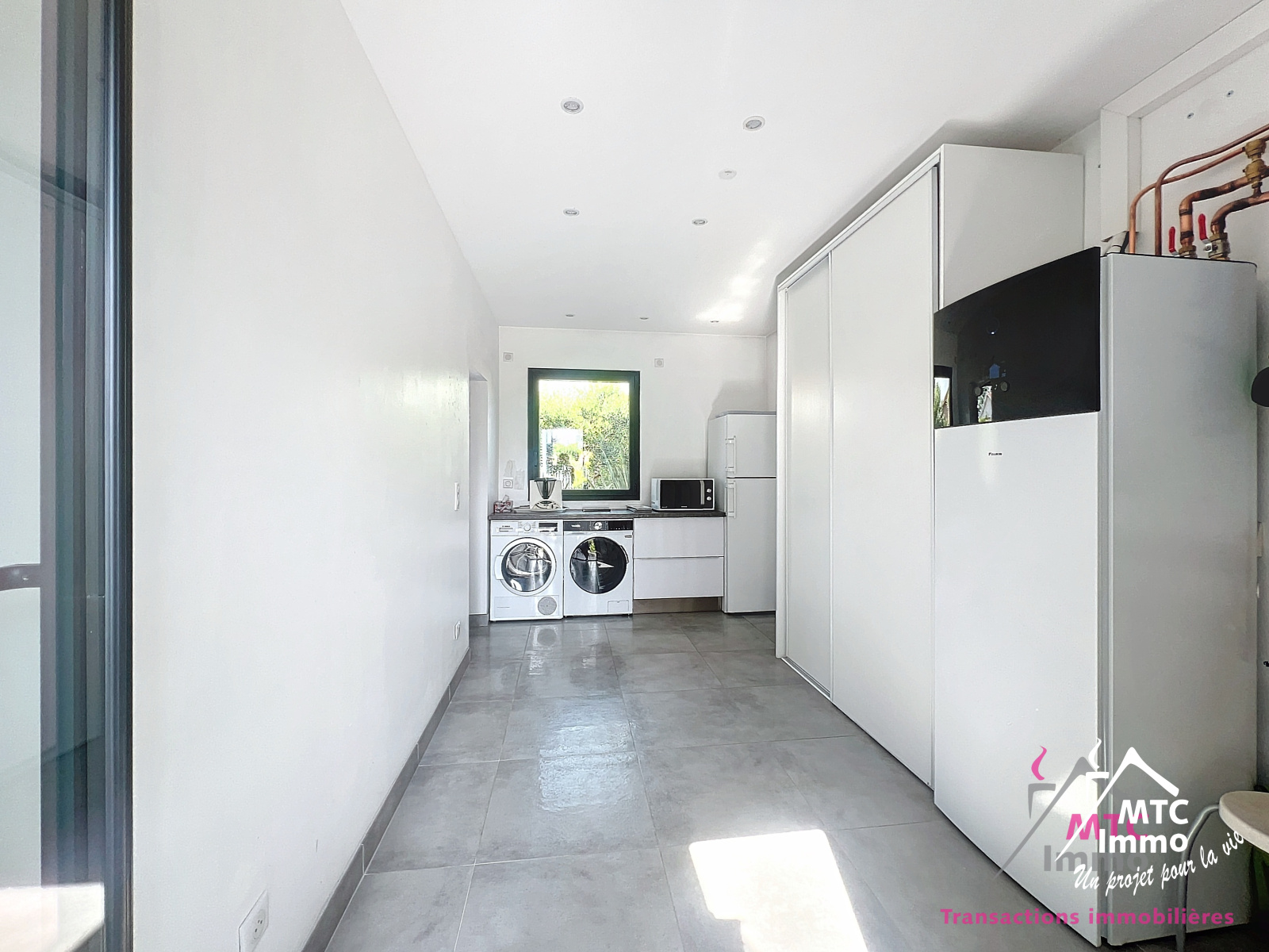 La cuisine aux lignes épurées et moderne se pare d'un blanc laqué. Composée de nombreux rangements et d'un beau plan de travail elle sera le lieu idéal pour cuisiner et recevoir. Pour une praticité quotidienne, un grand cellier/buanderie de 15m2 jouxte la cuisine.