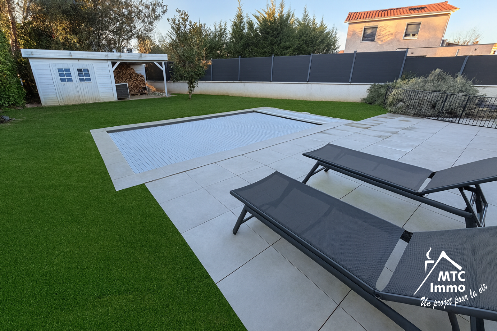 À l’extérieur, le jardin est entièrement aménagé pour profiter pleinement des beaux jours : un bassin à poissons apporte une touche de sérénité, tandis qu’un terrain de pétanque et une piscine au chlore de 6 × 3 mètres, construite en 2018 et équipée d’un volet roulant électrique immergé et d’un PVC armé, invitent à la détente. Une vaste terrasse de 140 m² recouverte de dalles, partiellement couverte par une pergola de 12 m², prolonge harmonieusement les espaces de vie. Un abri bois accueille le local technique de la piscine, et un garage de 13 m² avec une buanderie-cellier de 7 m² viennent compléter l’ensemble.