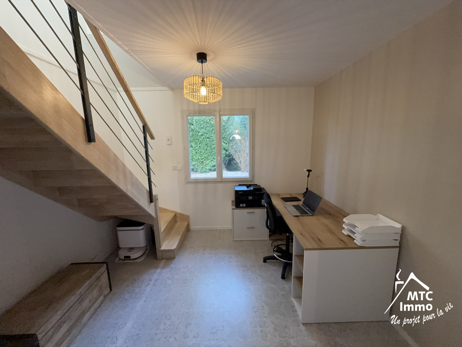 L’entrée (avec un placard mural) mène à une pièce de vie lumineuse, largement ouverte sur l’extérieur grâce à ses baies vitrées, créant une atmosphère chaleureuse et conviviale. Attenant au séjour, un bureau permet également d’accéder à l’étage. Le rez-de-chaussée comprend également une chambre, une salle de bains, un WC, ainsi qu’une suite parentale dotée d’un dressing et d’une salle d’eau privative, offrant un véritable espace nuit indépendant et confortable.