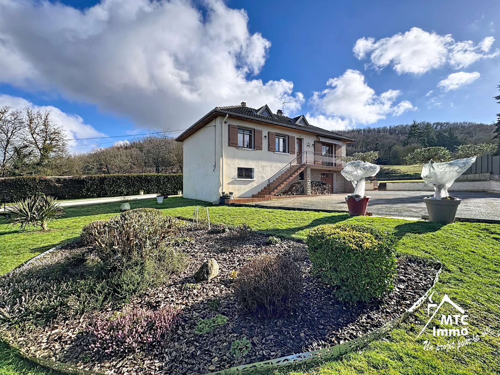 L’extérieur est très agréable avec une parcelle de terrain de1670m2 entièrement clôturée, arborée avec un portail électrique et suffisamment d’espace pour profiter sereinement des beaux jours dans le jardin sans aucun vis à vis et sans nuisance.