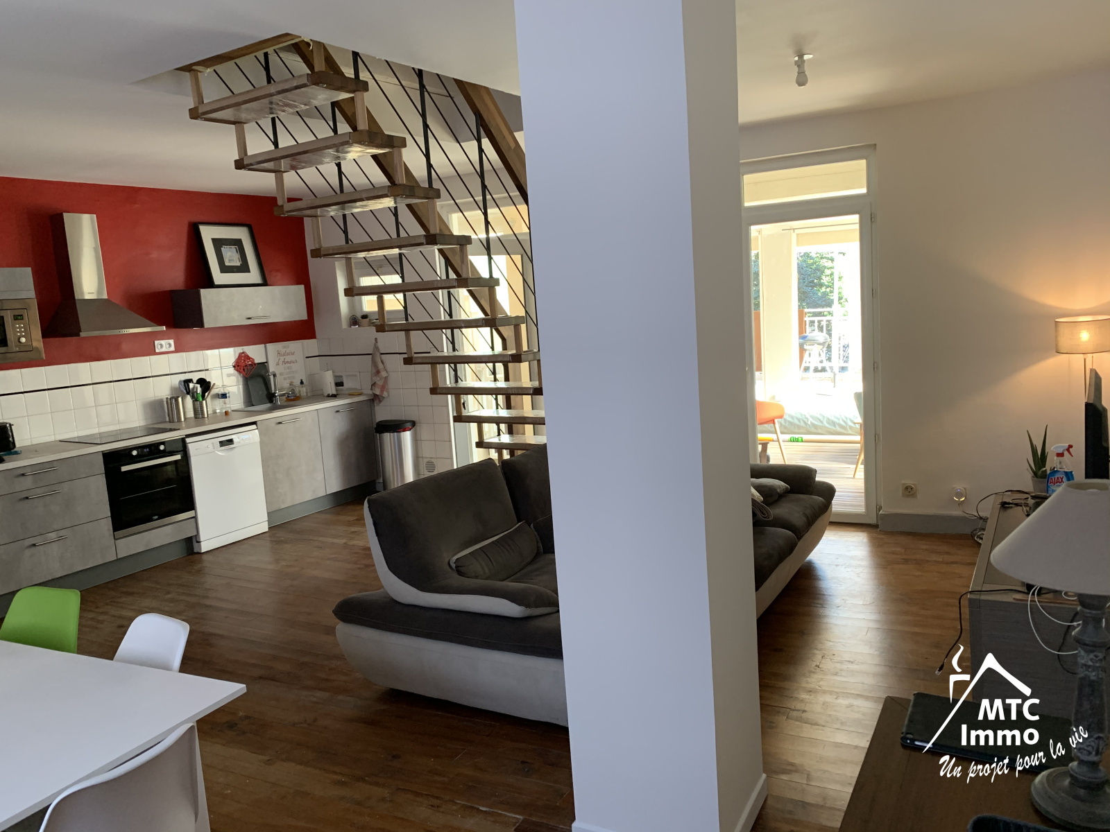 Cuisine équipée, Parquet au sol. Joli escalier au milieu de la pièce. Espace traversant Nord/Sud.
