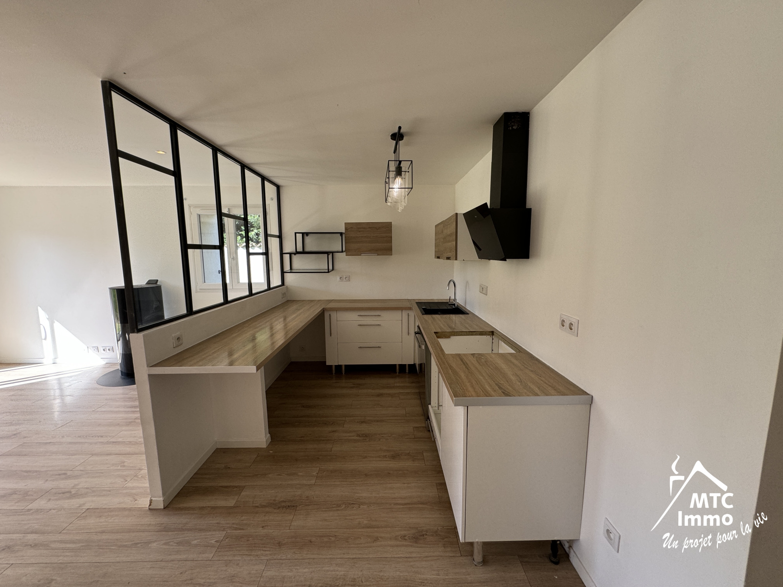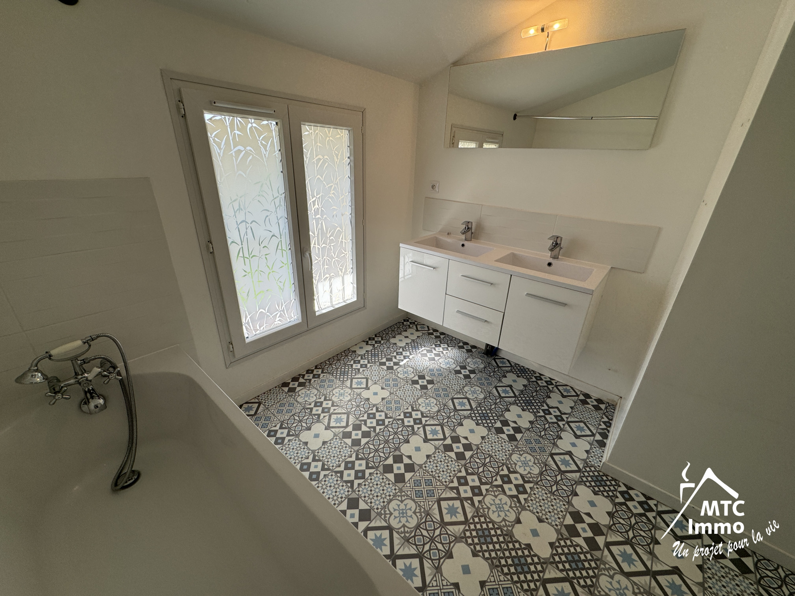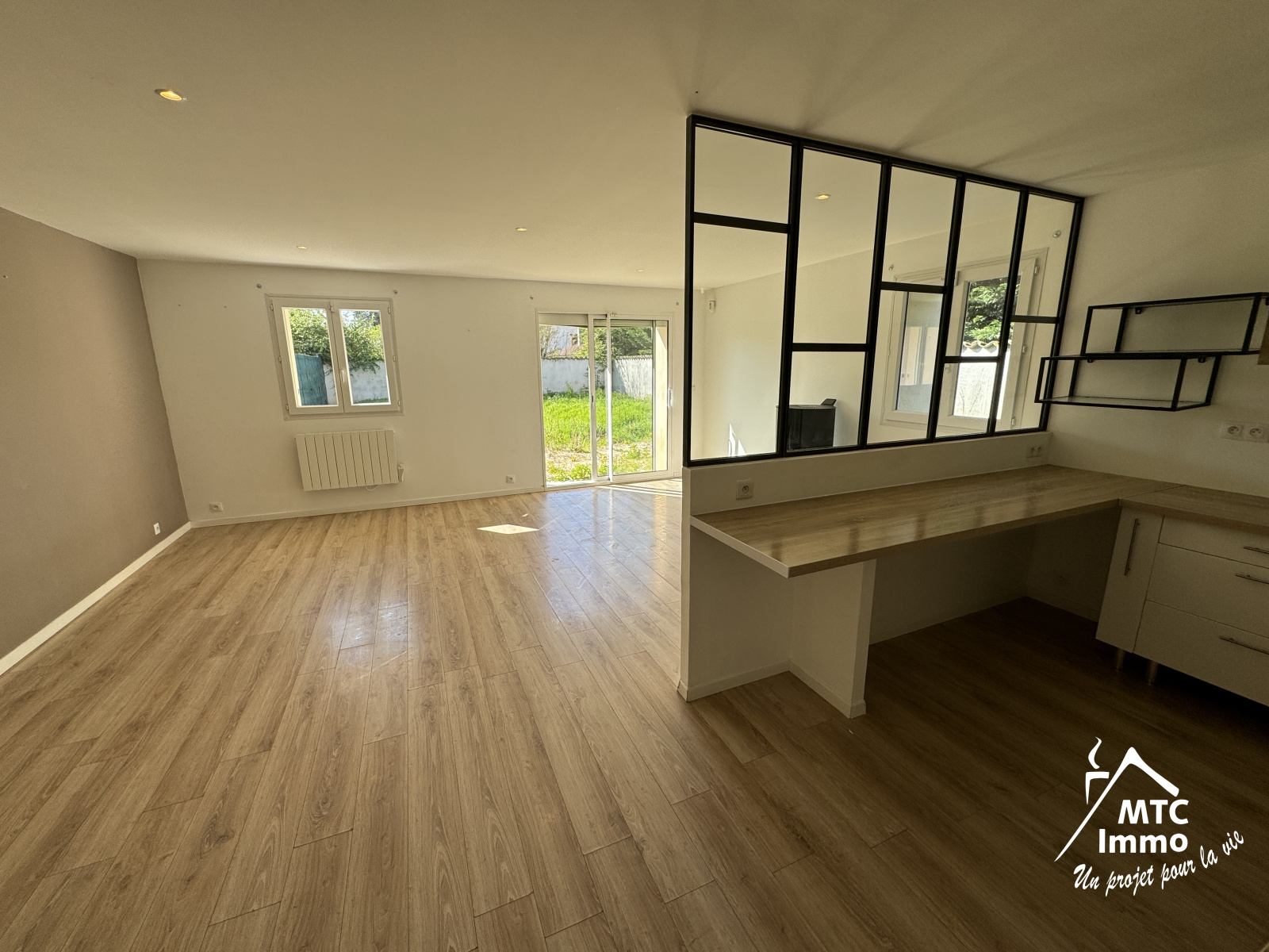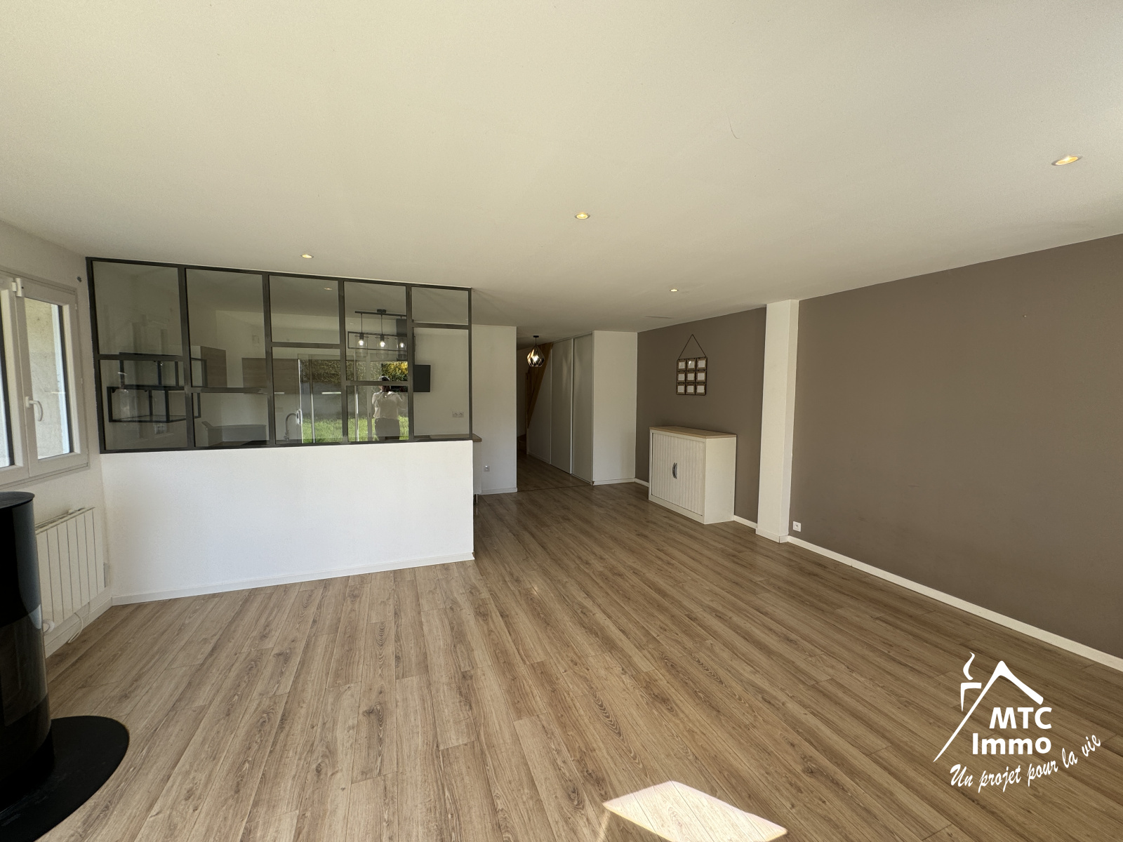 L'entrée de la maison (avec un placard mural) permet l'accès à une grande pièce de vie ouverte sur la cuisine. Le séjour est baigné par une belle luminosité grâce à la baie vitrée et donnant sur une terrasse. Le rez-de-chaussée se complète par un WC (avec lave-main) et une pièce pouvant servir de chambre ou de bureau. A l'étage, le dégagement (avec placard mural) dessert trois grandes chambres (avec chacune un placard mural), une salle de bains avec douche et un meuble double vasques ainsi qu'un WC. Vous serez séduits par la rénovation totale de la maison.